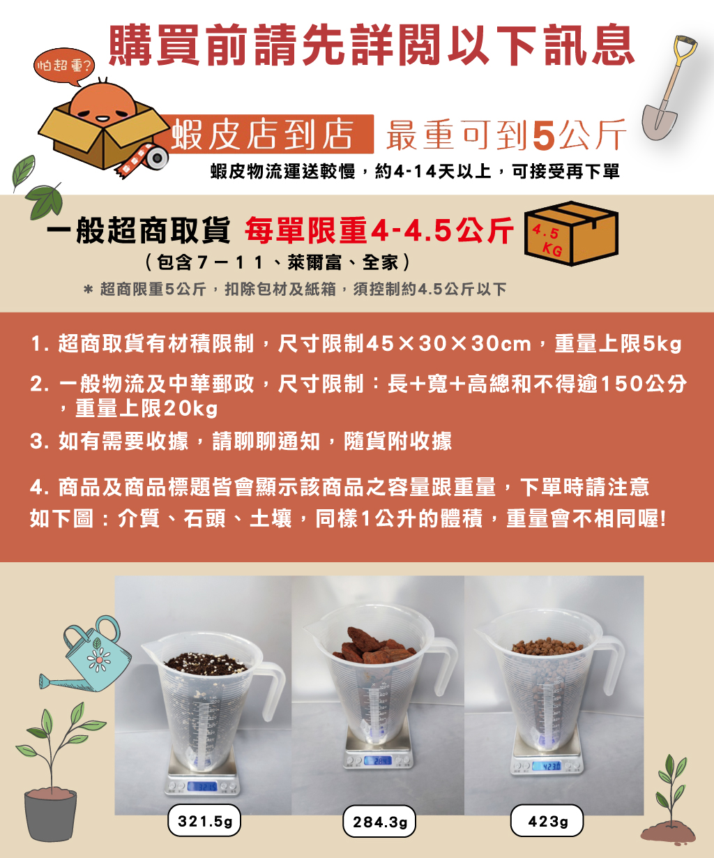 ⑤超商取貨有材積限制,尺寸限制45×30×30cm,重量上限5kg,有疑慮歡迎先聊聊