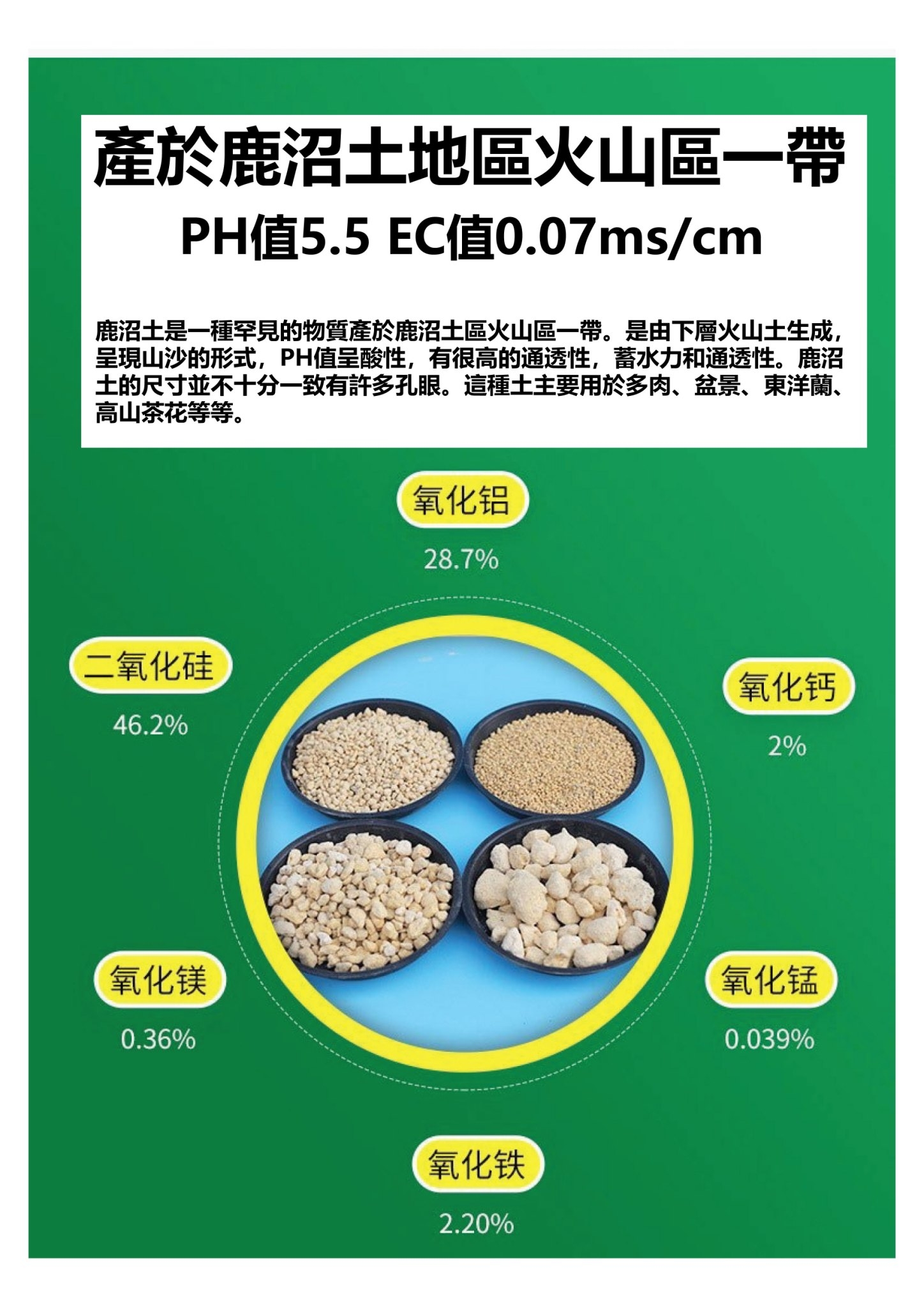 內容:原產於日本鹿沼地區的火山區一帶。由下層火山土生成之高透氣性火山沙。鹿沼土含鈣和鋁多一些所以呈現淺黃色,保水性和通氣性良好,pH偏酸性。