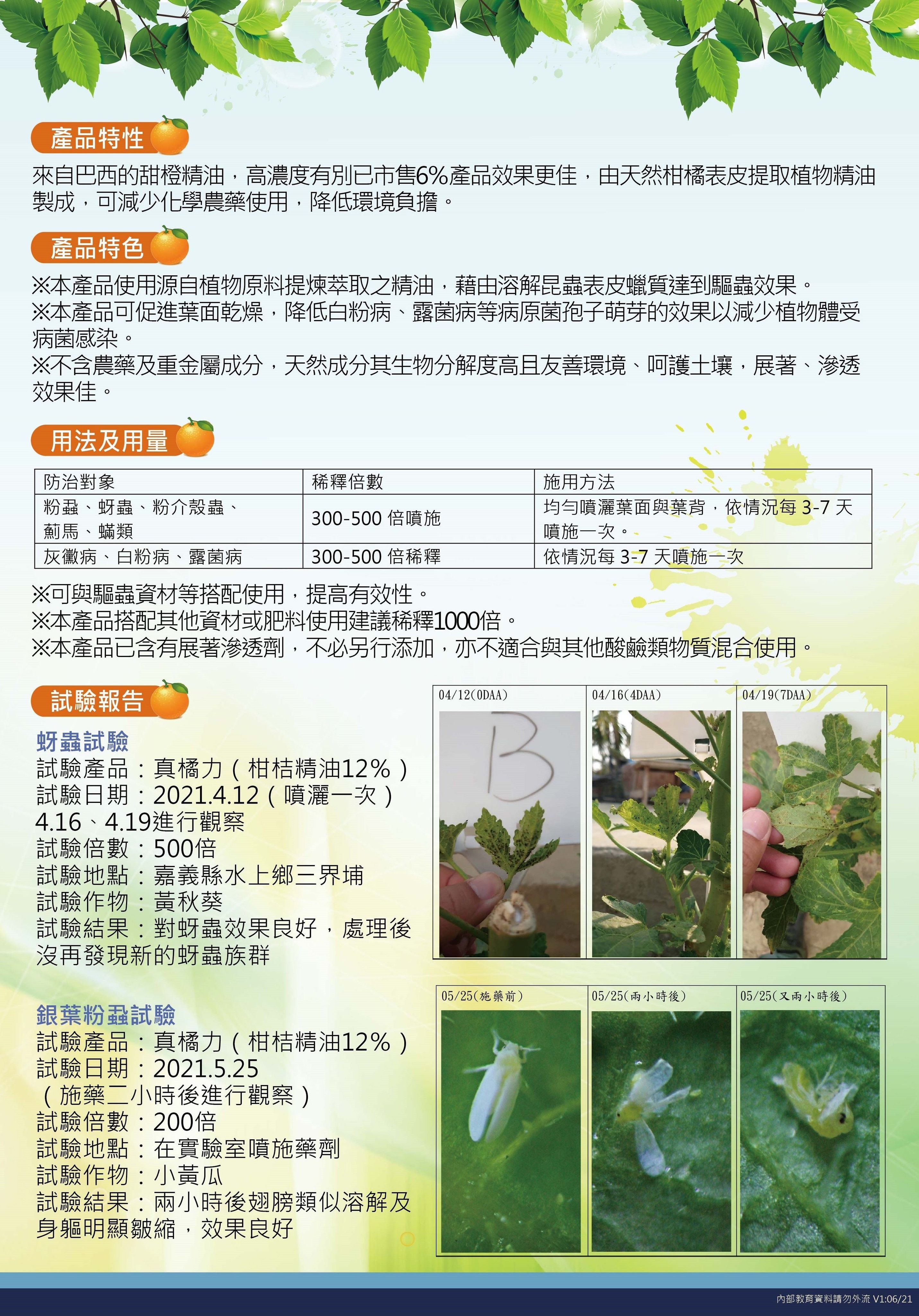 來自巴西的甜橙精油,高濃度有別於市售6%產品效果更佳,由天然柑橘表皮提取植物精油製成,可減少化學農藥使用,降低環境負擔。不含農藥及重金屬成分,天然成分其生物分解度高且友善環境、呵護土壤.展著、滲透效果佳。