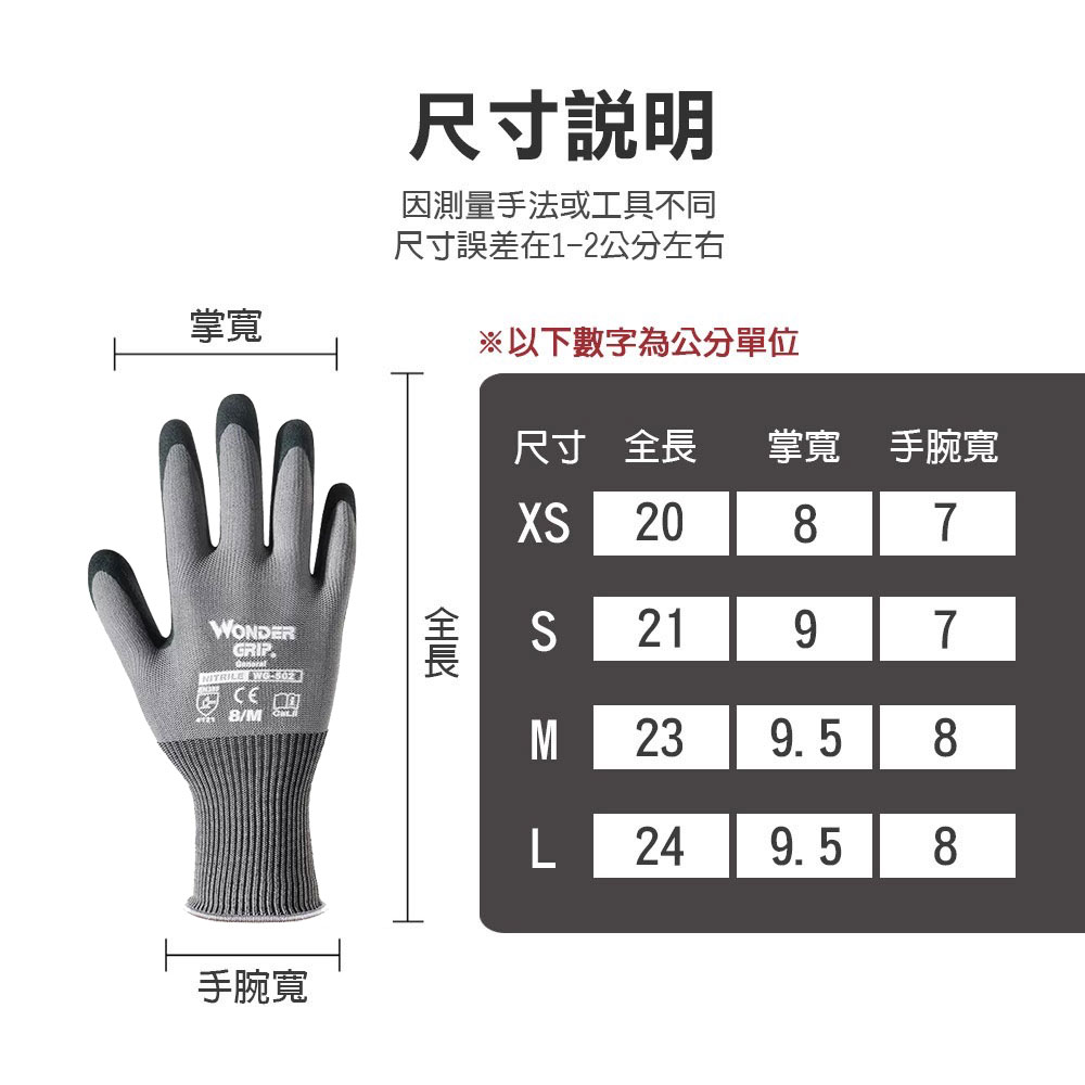M號,全長約22公分,中指適用長度7.5~8公分,手掌寬8.5~9.5公分